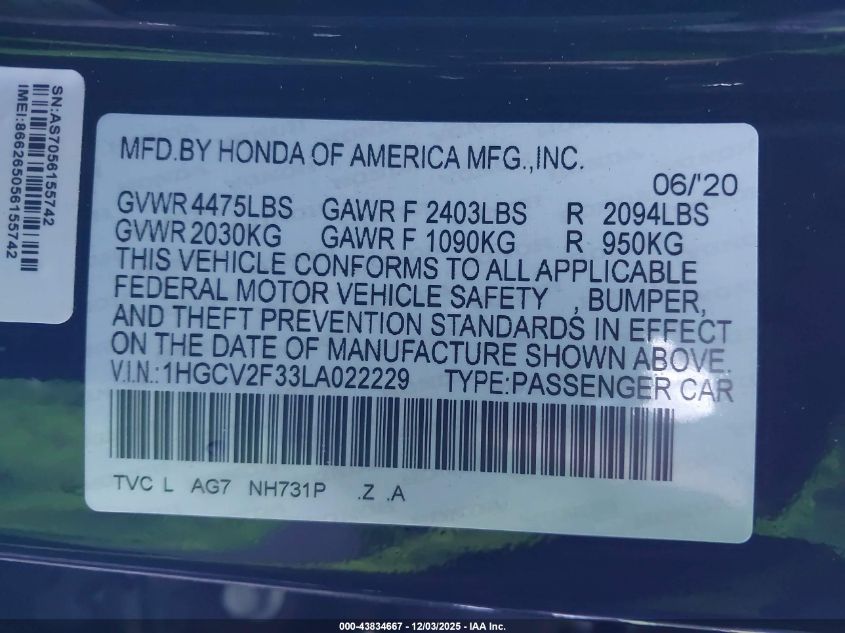 2020 HONDA ACCORD 2020 року Бензин, 2.0, Передний привод, vin - 1HGCV2F33LA022229 из США