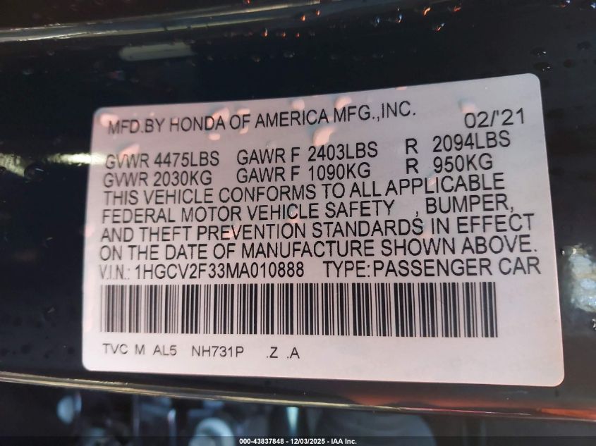 2021 HONDA ACCORD 2021 року Бензин, 2.0, Передний привод, vin - 1HGCV2F33MA010888 из США