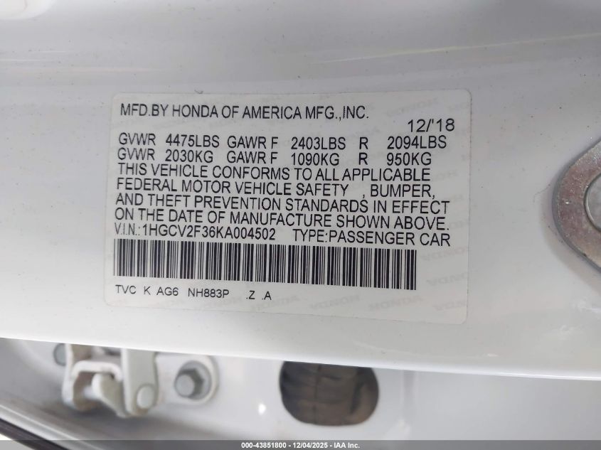 2019 HONDA ACCORD 2019 року Бензин, 2.0, Передний привод, vin - 1HGCV2F36KA004502 из США