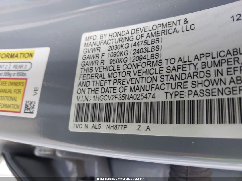 Цвет СерыйЦилиндры 4Привод Передний приводVIN 1HGCV2F35NA025474Состояние Заводится и едет (проверено)Повреждения Передняя и задняя AutoRIA