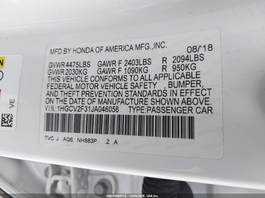 2018 HONDA ACCORD 2018 року Бензин, 2.0, Передний привод, vin - 1HGCV2F31JA046056 из США