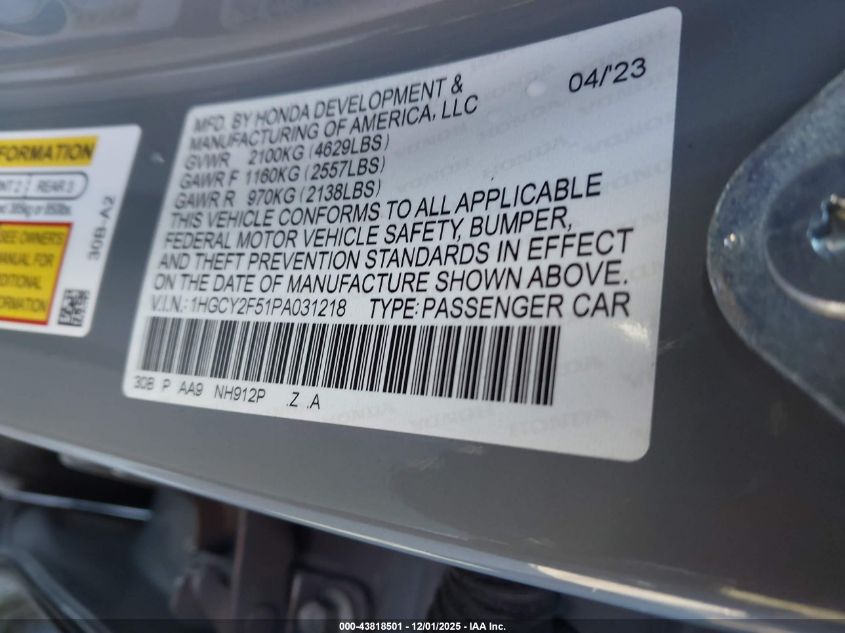 2023 HONDA ACCORD 2023 року Гибрид, 2.0, Передний привод, vin - 1HGCY2F51PA031218 из США