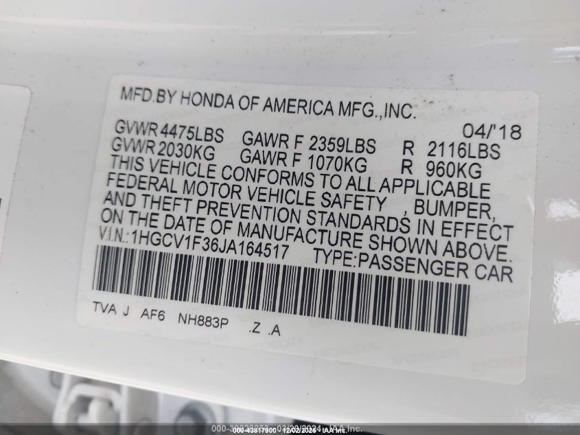 2018 HONDA ACCORD 2018 року Бензин, 1.5, Передний привод, vin - 1HGCV1F36JA164517 из США