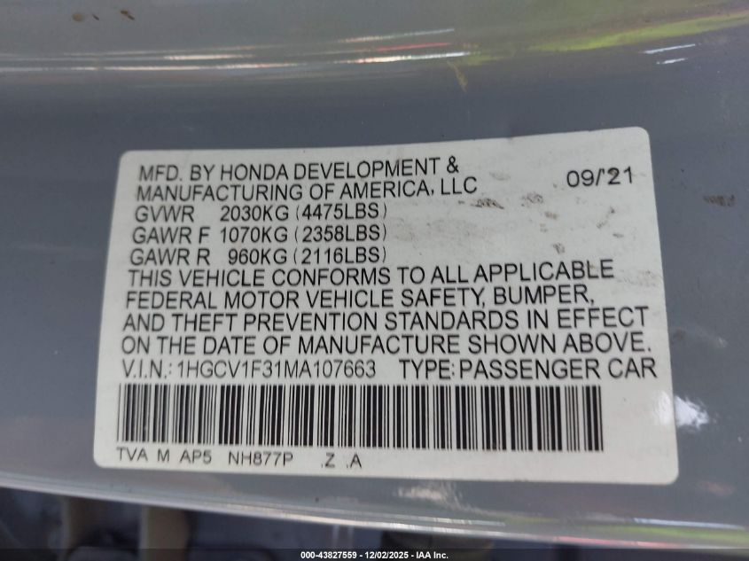 2021 HONDA ACCORD 2021 року Бензин, 1.5, Передний привод, vin - 1HGCV1F31MA107663 из США