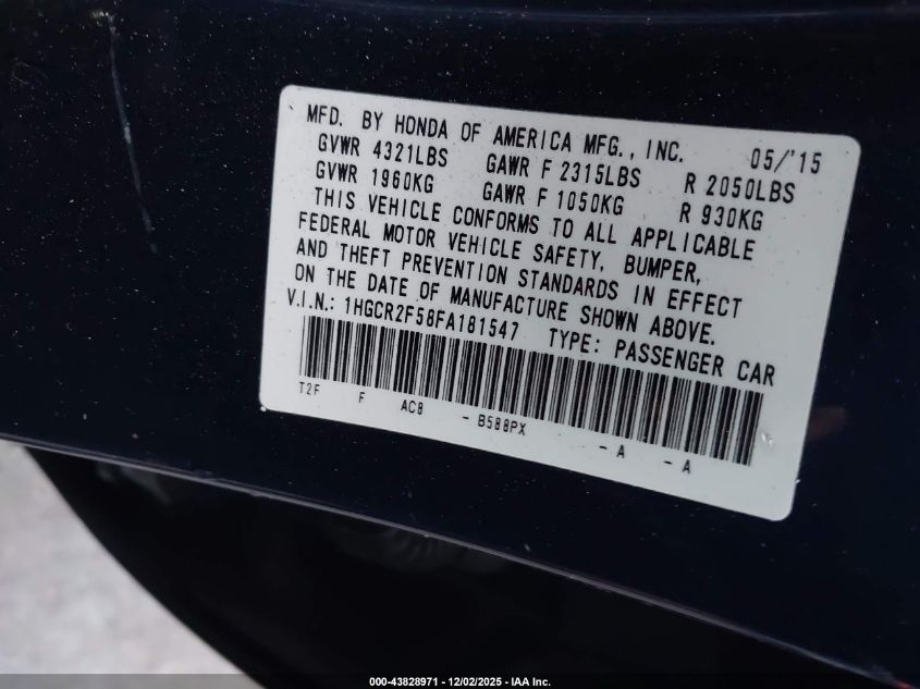2015 HONDA ACCORD 2015 року Бензин, 2.4, Передний привод, vin - 1HGCR2F58FA181547 из США