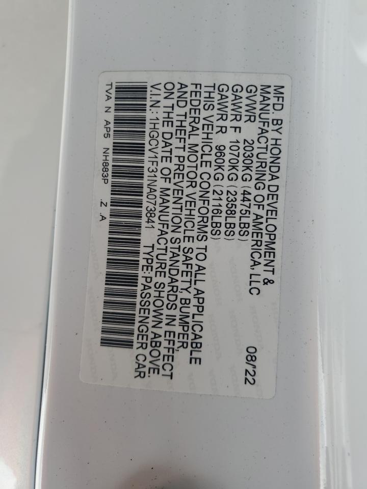 2022 HONDA ACCORD 2022 року Бензин, 1.5, , vin - 1HGCV1F31NA073841 из США