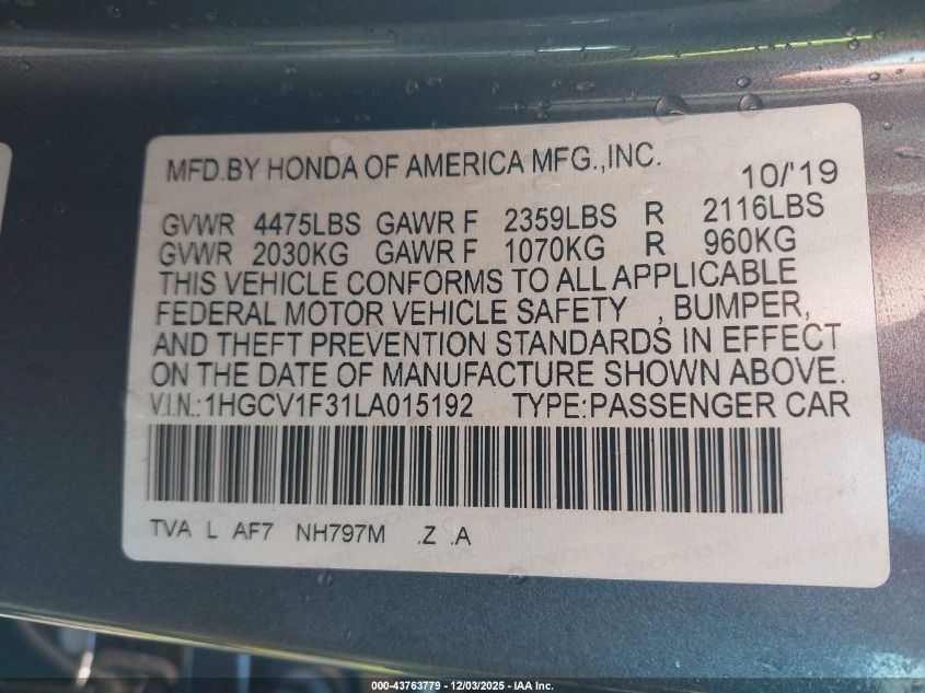 2020 HONDA ACCORD 2020 року Бензин, 1.5, Передний привод, vin - 1HGCV1F31LA015192 из США