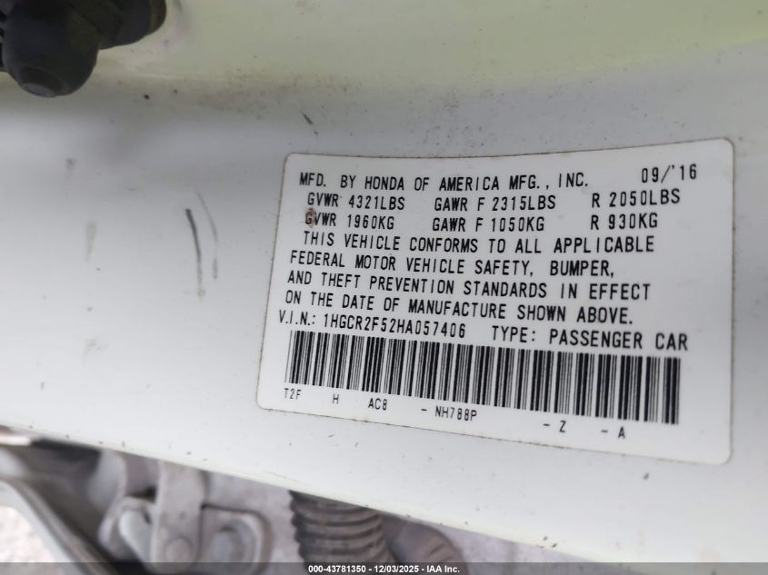 2017 HONDA ACCORD 2017 року Бензин, 2.4, Передний привод, vin - 1HGCR2F52HA057406 из США