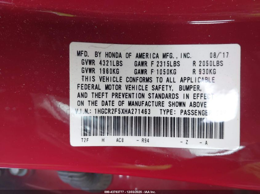 2017 HONDA ACCORD 2017 року Бензин, 2.4, Передний привод, vin - 1HGCR2F5XHA271463 из США