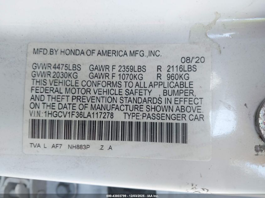 2020 HONDA ACCORD 2020 року Бензин, 1.5, Передний привод, vin - 1HGCV1F36LA117278 из США