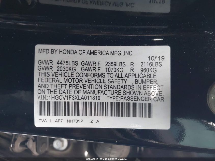 2020 HONDA ACCORD 2020 року Бензин, 1.5, Передний привод, vin - 1HGCV1F3XLA011819 из США