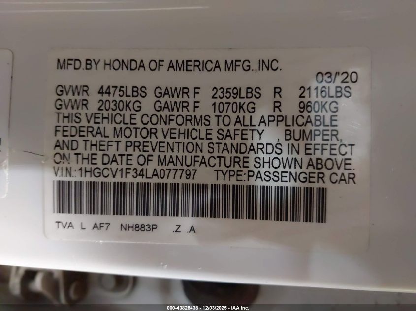 2020 HONDA ACCORD 2020 року Бензин, 1.5, Передний привод, vin - 1HGCV1F34LA077797 из США