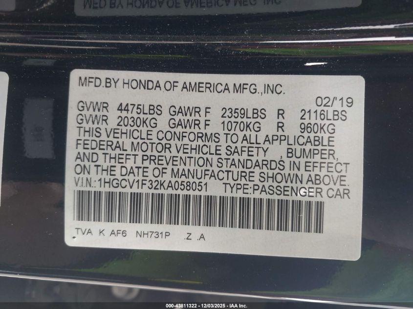 2019 HONDA ACCORD 2019 року Бензин, 1.5, Передний привод, vin - 1HGCV1F32KA058051 из США