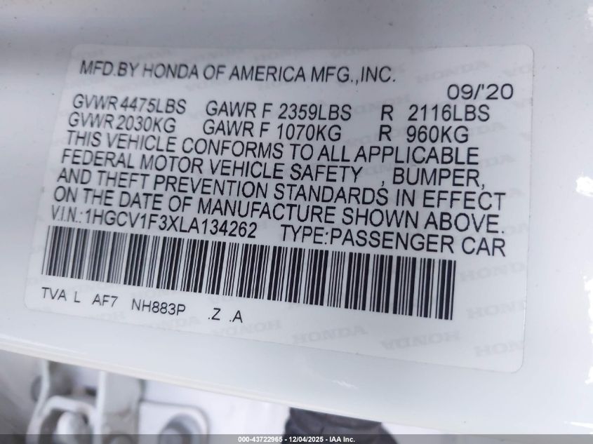 2020 HONDA ACCORD 2020 року Бензин, 1.5, Передний привод, vin - 1HGCV1F3XLA134262 из США