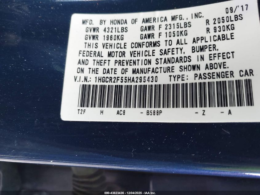 2017 HONDA ACCORD 2017 року Бензин, 2.4, Передний привод, vin - 1HGCR2F55HA295430 из США