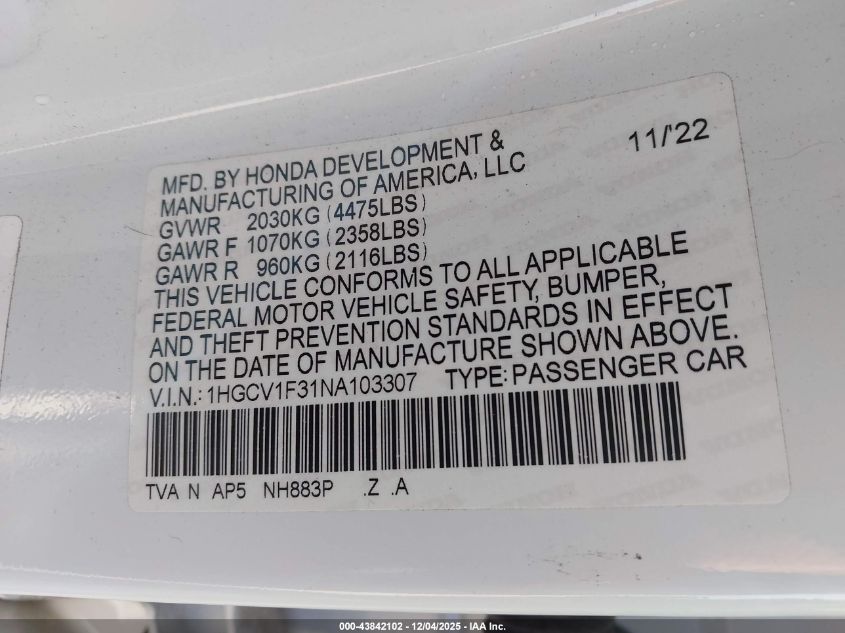 2022 HONDA ACCORD 2022 року Бензин, 1.5, Передний привод, vin - 1HGCV1F31NA103307 из США