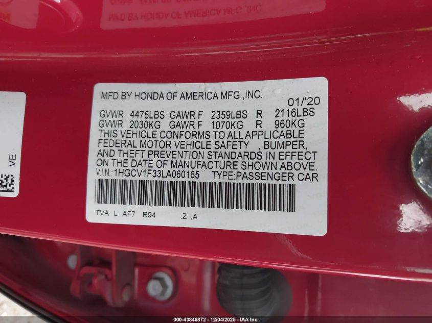 2020 HONDA ACCORD 2020 року Бензин, 1.5, Передний привод, vin - 1HGCV1F33LA060165 из США