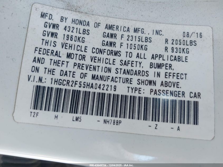 2017 HONDA ACCORD 2017 року Бензин, 2.4, Передний привод, vin - 1HGCR2F55HA042219 из США