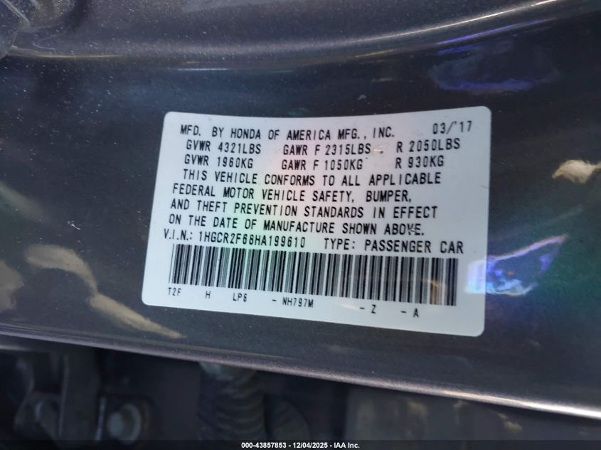 2017 HONDA ACCORD 2017 року Бензин, 2.4, Передний привод, vin - 1HGCR2F68HA199610 из США