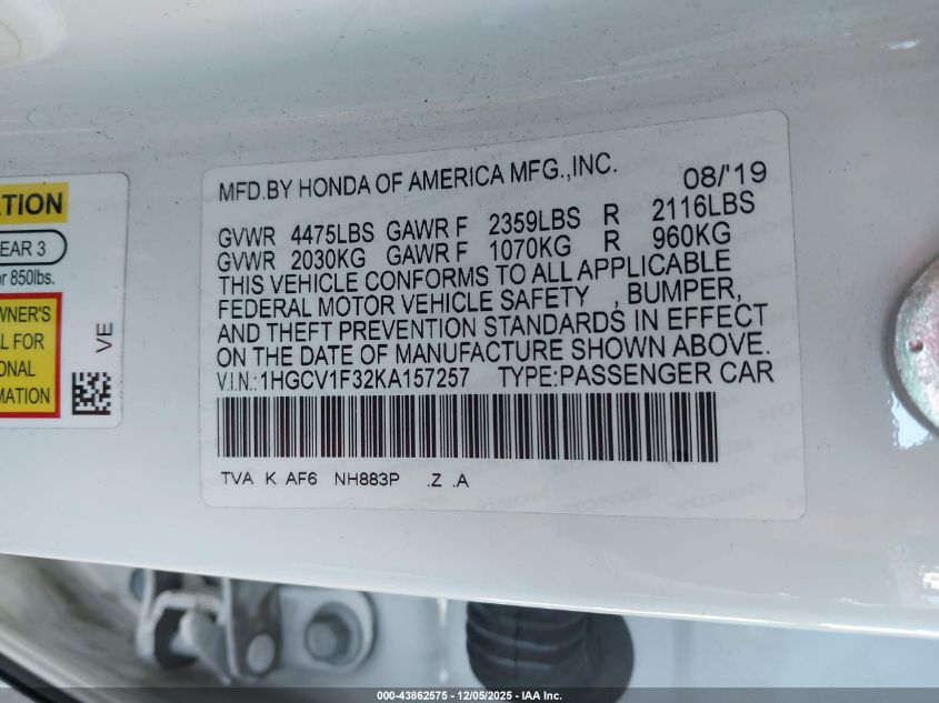 2019 HONDA ACCORD 2019 року Бензин, 1.5, Передний привод, vin - 1HGCV1F32KA157257 из США