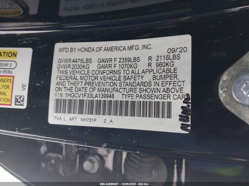 2020 HONDA ACCORD 2020 року Бензин, 1.5, Передний привод, vin - 1HGCV1F33LA139948 из США