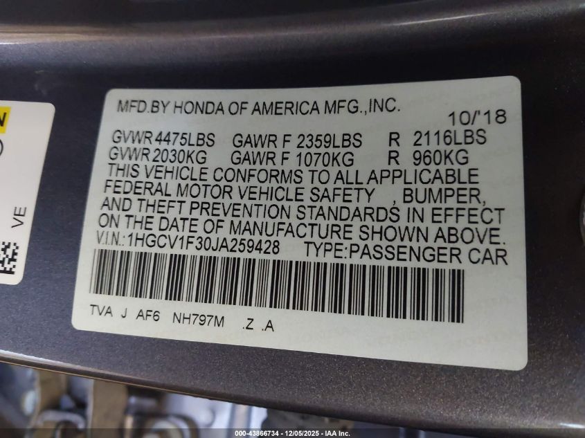 2018 HONDA ACCORD 2018 року Бензин, 1.5, Передний привод, vin - 1HGCV1F30JA259428 из США