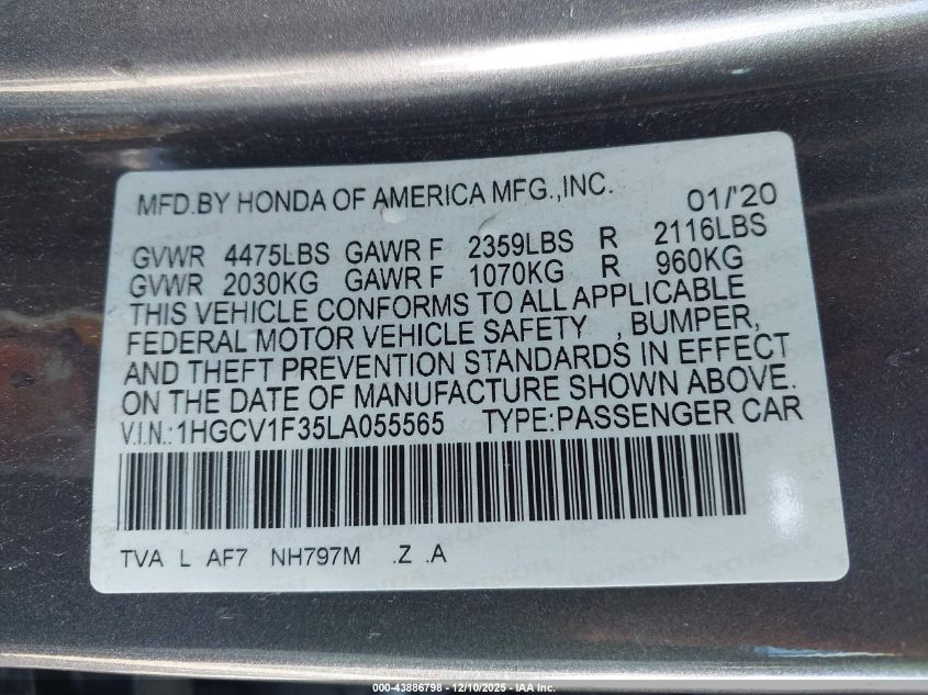 2020 HONDA ACCORD 2020 року Бензин, 1.5, Передний привод, vin - 1HGCV1F35LA055565 из США