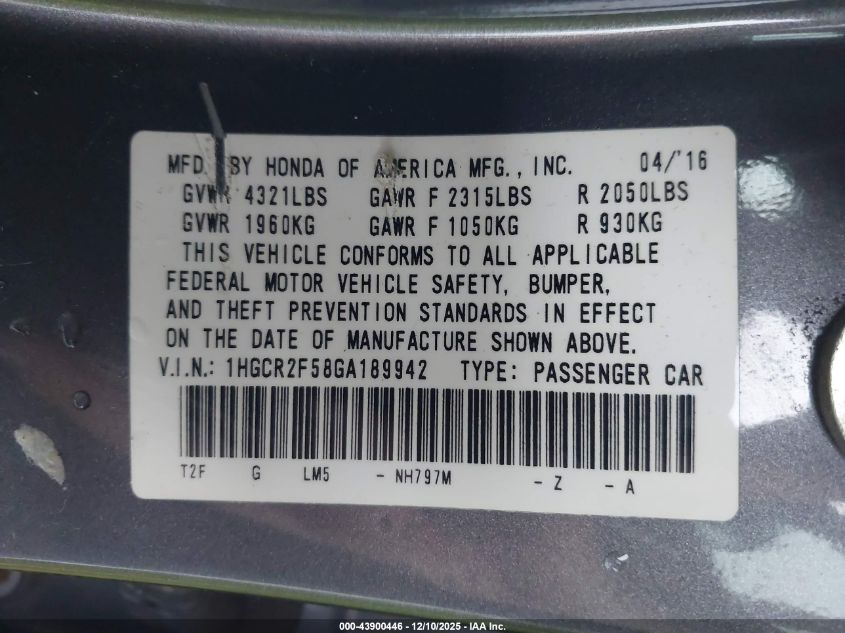 2016 HONDA ACCORD 2016 року Бензин, 2.4, Передний привод, vin - 1HGCR2F58GA189942 из США
