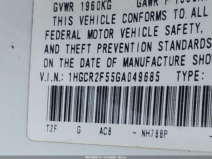Цвет БелыйЦилиндры 4Привод Передний приводVIN 1HGCR2F55GA049685Состояние СтационарноПовреждения Передняя левая AutoRIA
