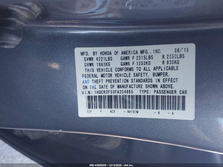 2015 HONDA ACCORD 2015 року Бензин, 2.4, Передний привод, vin - 1HGCR2F50FA204965 из США