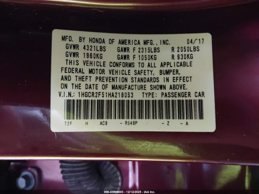 2017 HONDA ACCORD 2017 року Бензин, 2.4, Передний привод, vin - 1HGCR2F51HA218053 из США