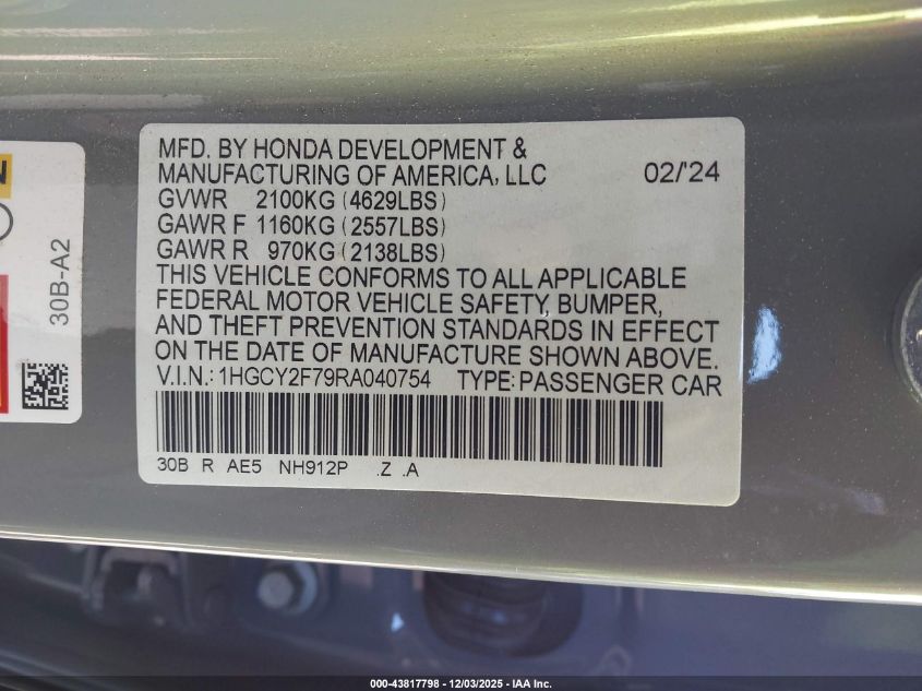 2024 HONDA ACCORD 2024 року Гибрид, 2.0, Передний привод, vin - 1HGCY2F79RA040754 из США