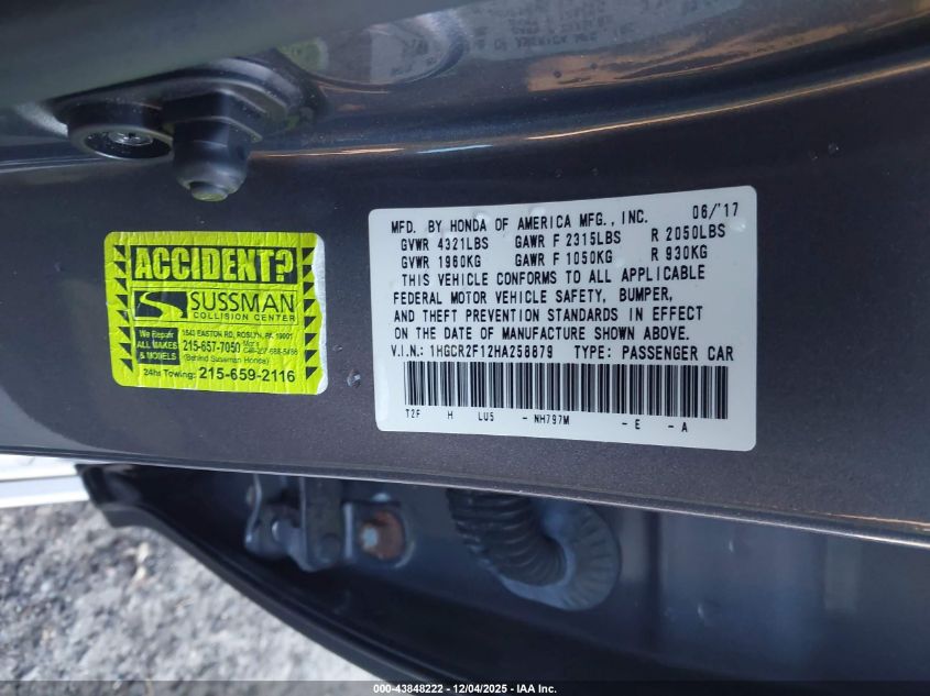 2017 HONDA ACCORD 2017 року Бензин, 2.4, Передний привод, vin - 1HGCR2F12HA258879 из США