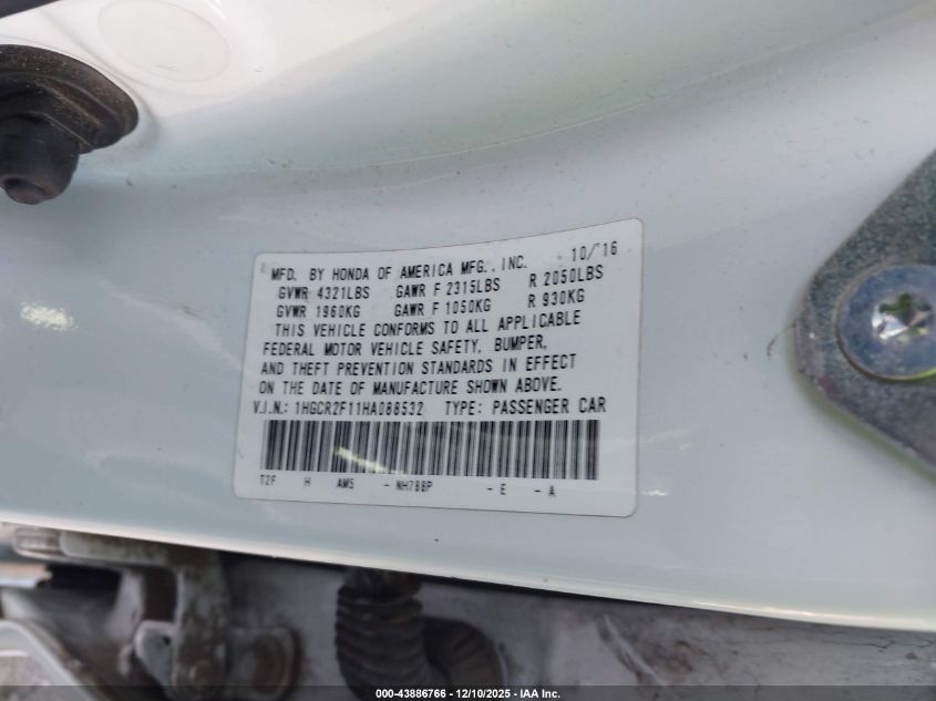 2017 HONDA ACCORD 2017 року Бензин, 2.4, Передний привод, vin - 1HGCR2F11HA088532 из США