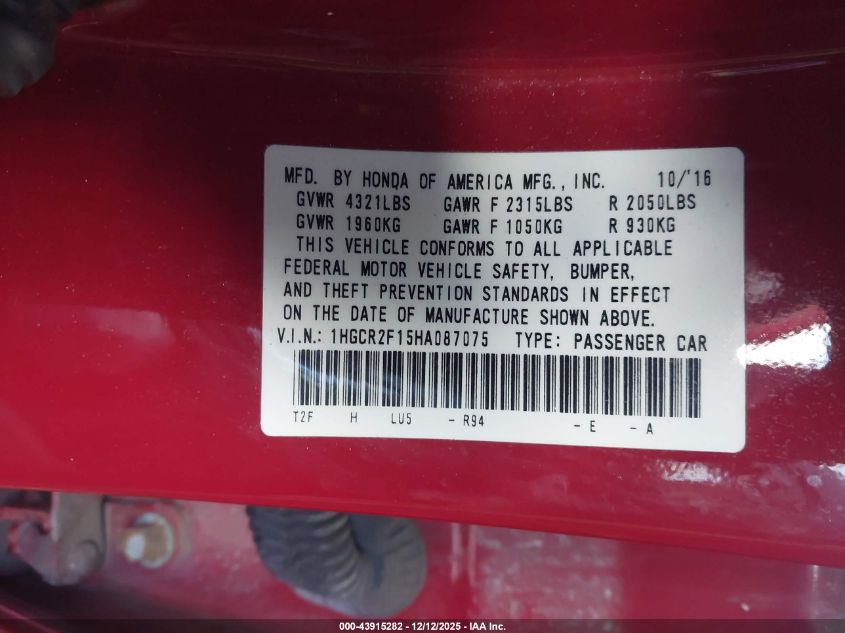2017 HONDA ACCORD 2017 року Бензин, 2.4, Передний привод, vin - 1HGCR2F15HA087075 из США