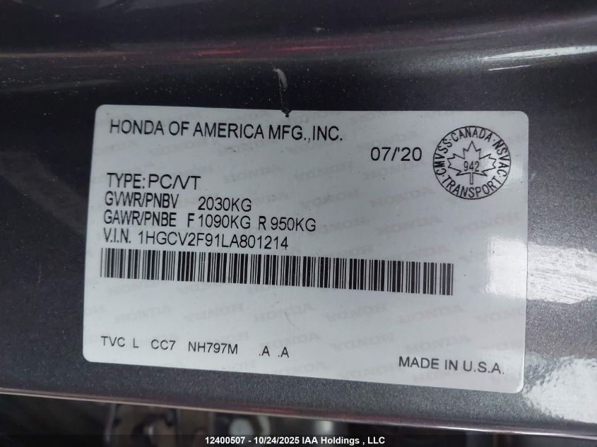 2020 HONDA ACCORD 2020 року Бензин, , Передний привод, vin - 1HGCV2F91LA801214 из США