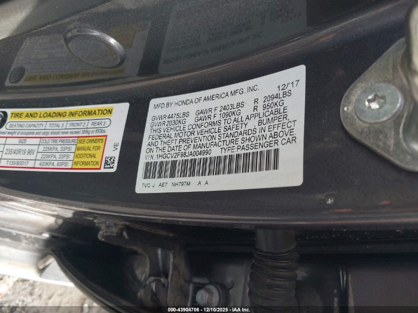 Цвет СерыйЦилиндры 4Привод Передний приводVIN 1HGCV2F98JA004990Состояние СтационарноПовреждения Передняя или задняя AutoRIA