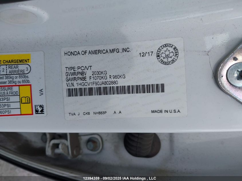 2018 HONDA ACCORD 2018 року Бензин, , Передний привод, vin - 1HGCV1F90JA802880 из США