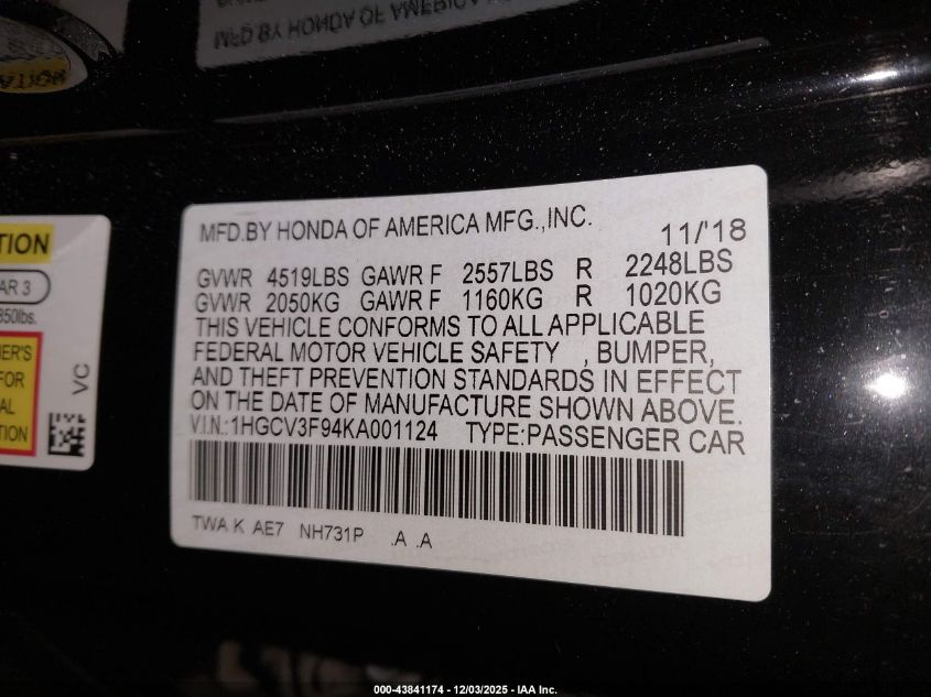 2019 HONDA ACCORD 2019 року Гибрид, 2.0, Передний привод, vin - 1HGCV3F94KA001124 из США