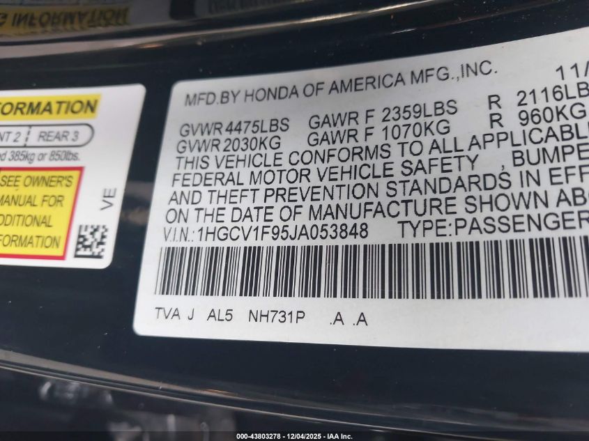 2018 HONDA ACCORD 2018 року Бензин, 1.5, Передний привод, vin - 1HGCV1F95JA053848 из США
