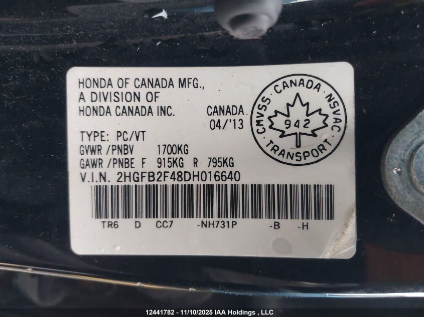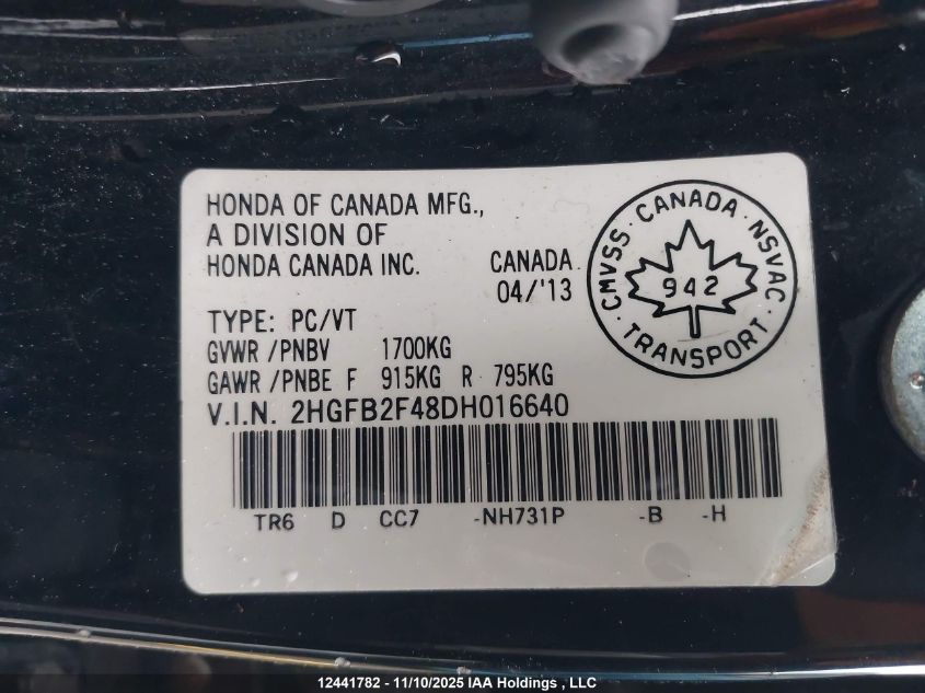 2013 HONDA CIVIC 2013 року Бензин, , Передний привод, vin - 2HGFB2F48DH016640 из США
