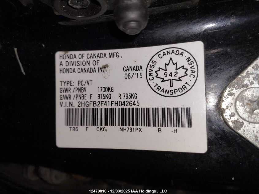 2015 HONDA CIVIC 2015 року Бензин, , Передний привод, vin - 2HGFB2F41FH042645 из США