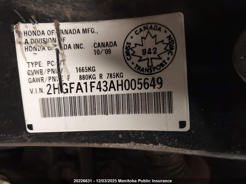 2010 HONDA CIVIC 2010 року Бензин, , Передний привод, vin - 2HGFA1F43AH005649 из США