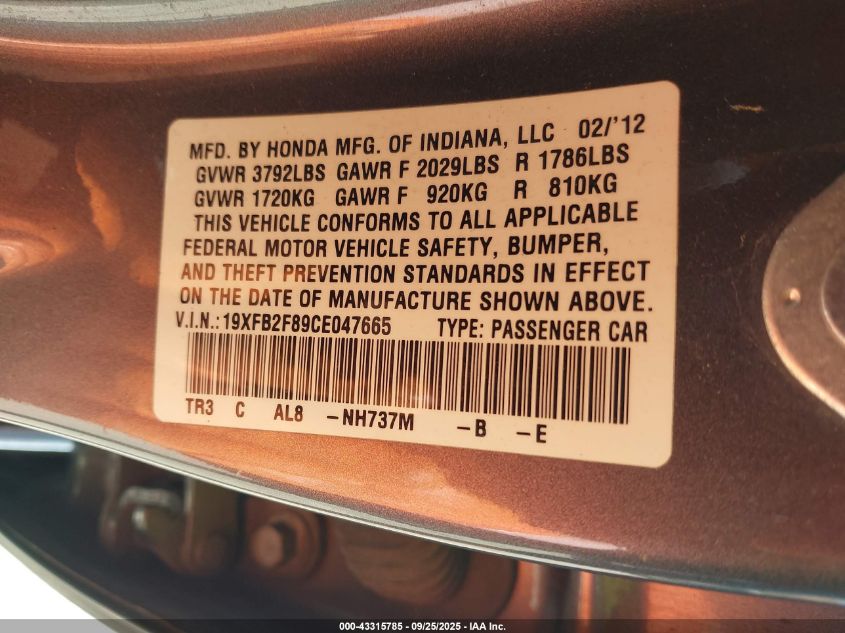 2012 HONDA CIVIC 2012 року Бензин, 1.8, Передний привод, vin - 19XFB2F89CE047665 из США