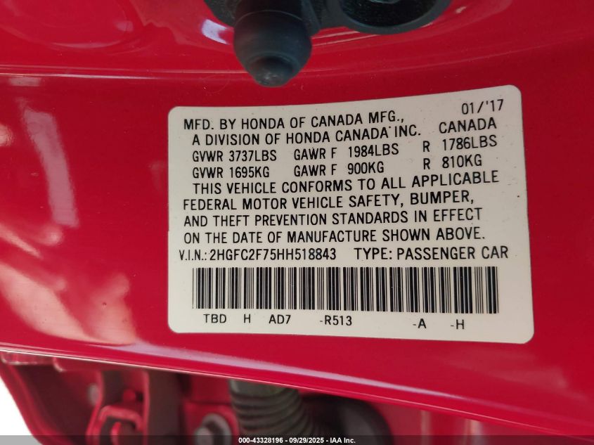 2017 HONDA CIVIC 2017 року Бензин, 2.0, Передний привод, vin - 2HGFC2F75HH518843 из США