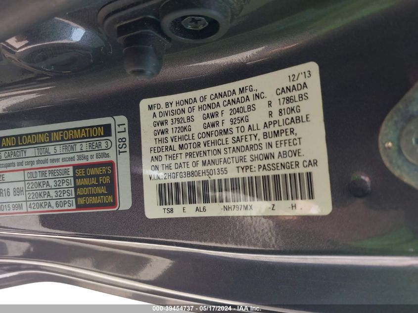 2014 HONDA CIVIC 2014 року Бензин, 1.8, Передний привод, vin - 2HGFG3B80EH501355 из США
