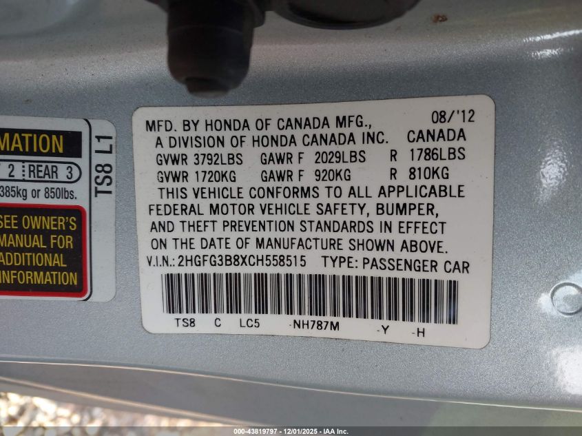 2012 HONDA CIVIC 2012 року Бензин, 1.8, Передний привод, vin - 2HGFG3B8XCH558515 из США