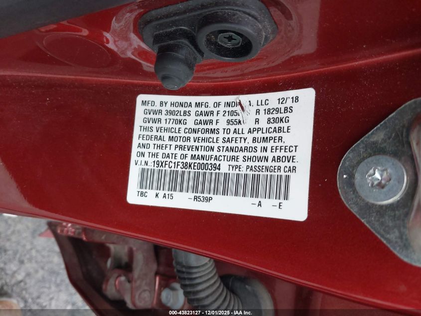 2019 HONDA CIVIC 2019 року Бензин, 1.5, Передний привод, vin - 19XFC1F38KE000394 из США