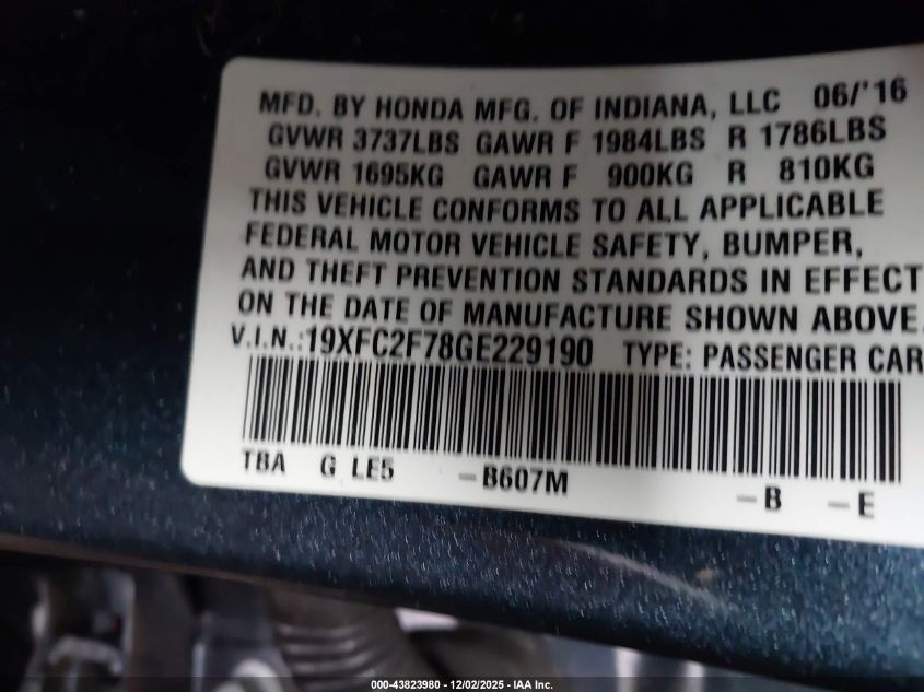 2016 HONDA CIVIC 2016 року Бензин, 2.0, Передний привод, vin - 19XFC2F78GE229190 из США