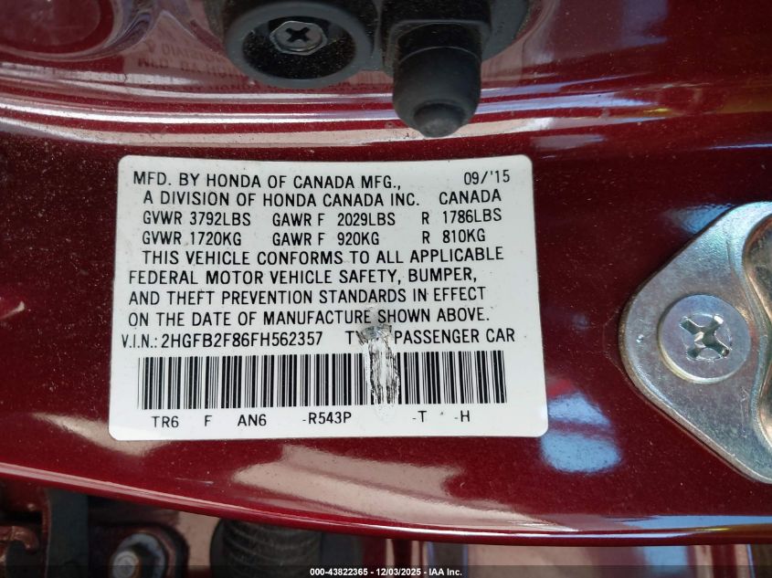 2015 HONDA CIVIC 2015 року Бензин, 1.8, Передний привод, vin - 2HGFB2F86FH562357 из США
